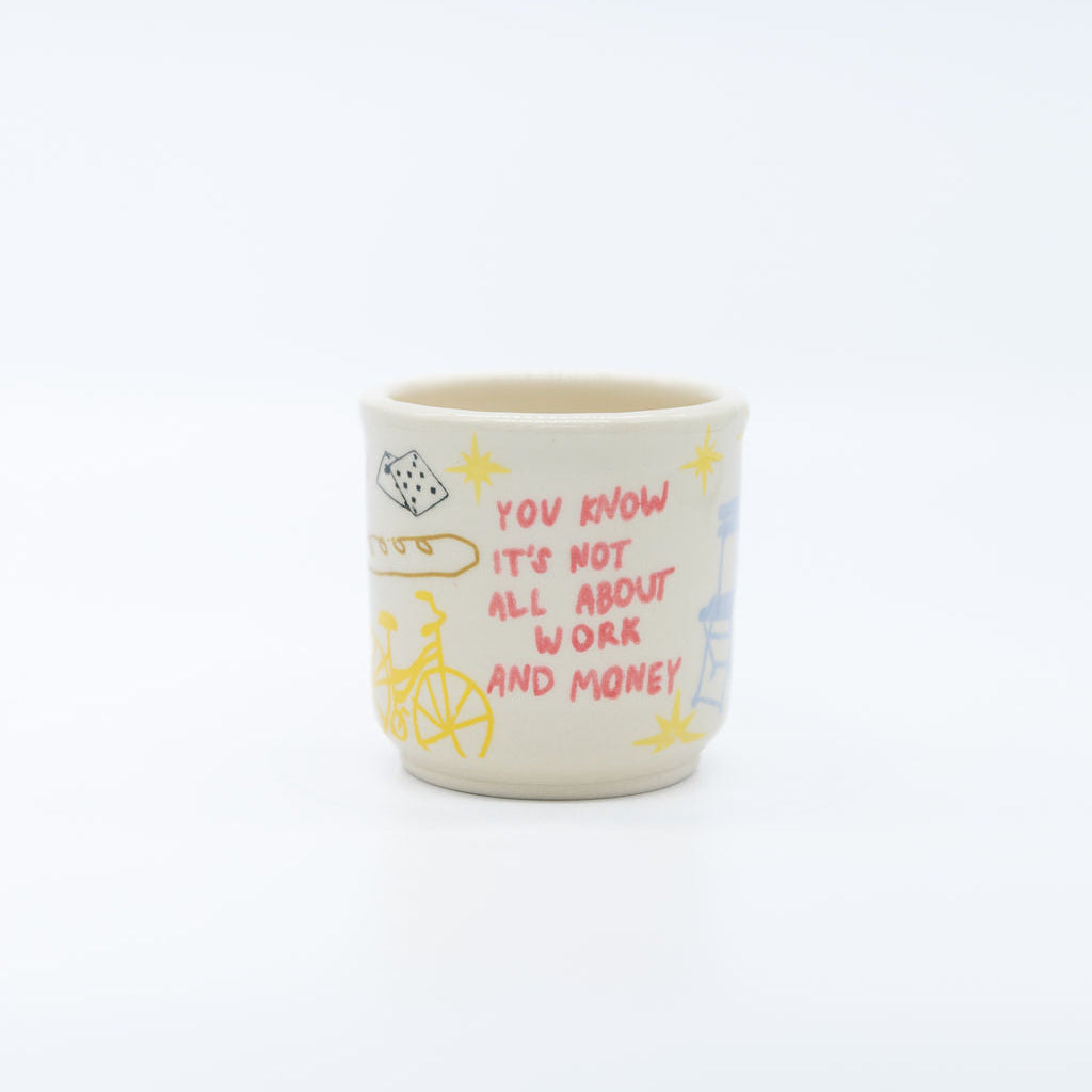 Each piece in this design is one of a kind. Beyond the namesake phrase, each mug has a unique mix of colors and imagery. When ordered online, one will be selected at random from the stock.